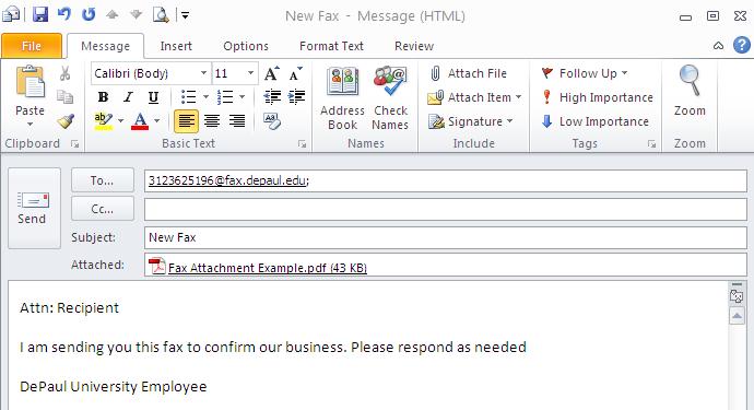 In the “To” field, enter the fax number that you wish to send the fax to. Complete the address by appending @fax.depaul.edu to it. Example: 3123628000@fax.depaul.edu